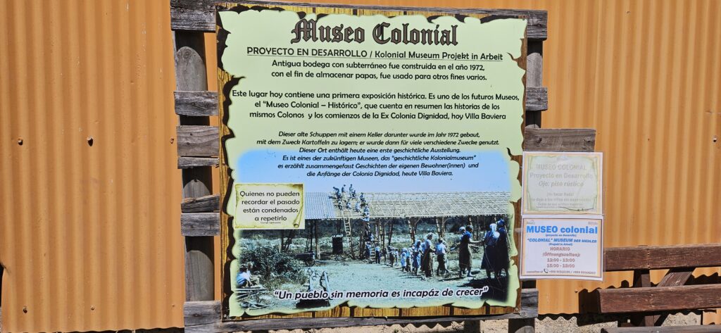 Als ich beim Museum ankam, hatte ein deutsches Urlaubspaar sich gerade eine geführte Tour organisiert und ich durfe mich anschließen. Kurz darauf folgte noch eine Langzeitreisende mit Weltreisemobil aus BaWü, die sich ebenfalls anschließen durfte. Wie sich herausstellte, war die liebe Dame, die uns die Führung auf Deutsch gab, selbst Teil der allerersten Auswanderer, die hier Anfang der 60er, als sie noch ein kleines Kind war, mehr oder weniger aus dem Nichts eine autarke Siedlung aufbauen mussten.