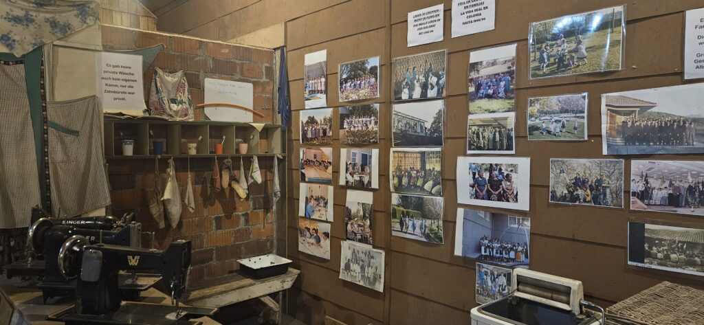 Sie schilderte uns sehr anschaulich immer wieder mit Verweis auf die Bilder und Ausstellungsstücke, wie sich ihr Leben ohne Familie oder freien Kontakt innerhalb der Siedlung, mit strikter Trennung von Männlein und Weiblein, etc. (siehe o.g. Links), aus ihrer Perspektive zugetragen hat, die nie etwas anderes kennengelernt hatte. Und was es dann für ein Schock war, als die Außenwelt über sie hereinbrach.