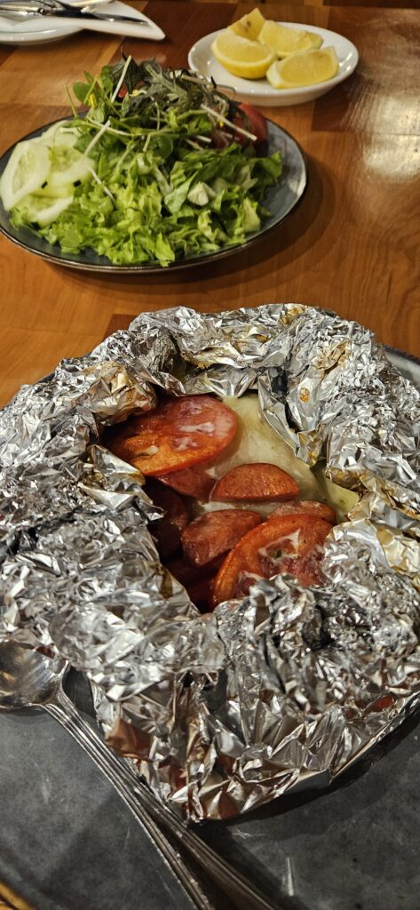 In Castro angekommen, gab es dann mit Käse überbackenen Lachs in einer Sahnesoße mit grünem Spargel und Würstchen: