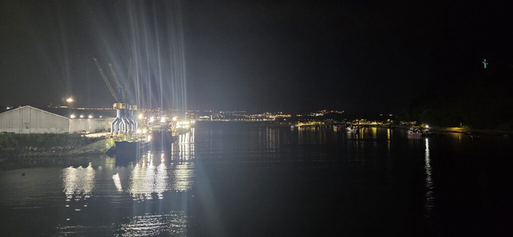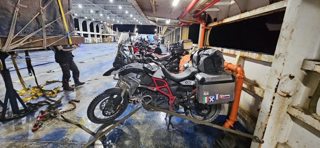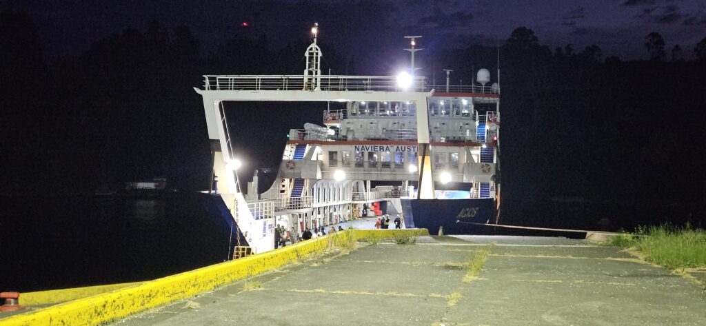 Ich hätte gerne die Fähre in Hornopiren genommen und die ganze Ruta 7 gefahren, aber im Gegensatz zu meiner Prüfung am Vorabend, war diese nun die nächsten drei Tage ausgebucht… Die 9-Stunden-Fähre zurück nach Chaitén wäre am nächsten Tag wieder 90 Euro gewesen mit doofer Abfahrtszeit. Aber, für heute Abend fährt sie noch um 23 Uhr und ist sogar subventioniert, sodass es mich nur 23 Euro kostet hat. Also noch schnell irgendwas zu essen organisiert, das Motorrad wieder vollständig beladen, ausgecheckt und um 21 Uhr zum Fährhafen gefahren. War zwar etwas gemeingefährlich mit meinem schlechten Sehen bei Nacht und den Straßenverhältnissen hier, aber naja, bin angekommen. Allerdings hat das Lämpchen wieder geleuchtet. Wird jetzt aber gekonnt ignoriert.