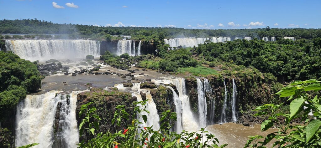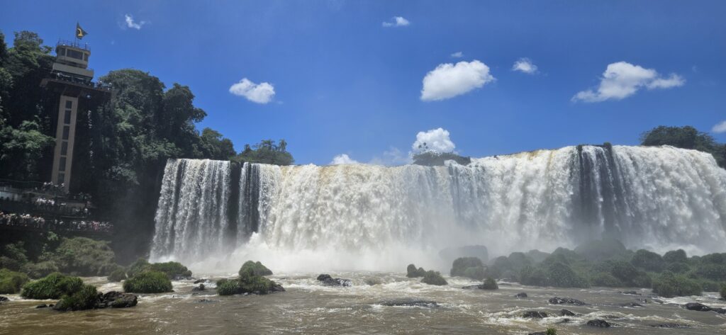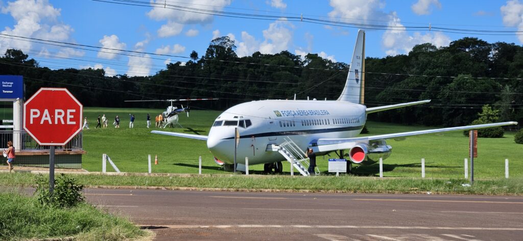 Der Bus stoppt kurz an der argentinischen Grenzstation vor der Brücke, die ich die letzten Tage vom Zimmer aus begutachten konnte. Passkontrolle, das übliche. Danach ging es über die Brücke vorbei an einem aktuellen Neubau des Grenzpostens auf brasilianischer Seite. Durch den aktuellen Grenzposten fährt der Bus einfach durch ohne anzuhalten – man ist also irgendwie illegal im Land – oder vielleicht auch nicht? Wer weiß… Nach einer guten halben Stunde kommt man dann direkt vorm Eingang des Nationalparks an. Dieser ist aber noch weitere 10km von den Wasserfällen entfernt.
